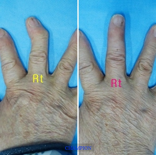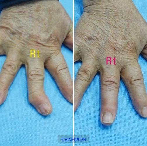 평생 손가락휨 때문에 손 모양이 콤플렉스였던 환자는 가정일을 포함한 일상생활에서 불편함이 많았고, 나이가 들면서 관절염이 생기고 손가락이 더욱 휘어지는 손가락휨, 굴지증 변형때문에 한번에 치료할 수 있는 외과적 처치 방법을 선택하여 부분마취로 진행된 굴지증 수술은 단 20분 만에 끝났고, 다음 날부터 가벼운 일상생활에 복귀할 수 있었습니다. 무엇보다 손 모양이 자연스러워져 “이제는 자신 있게 악수를 할 수 있다"라며 만족감을 표현했습니다.
